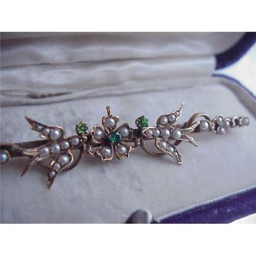 Highly lustrous seed pearl Edwardian large gold brooch. This is an uncommonly found large brooch that is an amazing 3 inches in length. It has a pair of swallow birds holding the central flower. The brooch is encrusted with rich lustrous pearls and further decorated with 3 deep green stones which look to be green garnets. The brooch is 14 KT and has a safety catch. This is a high quality antique brooch to wear proudly and enjoy adding to one?s collection of fine Victorian-Antique jewelry.