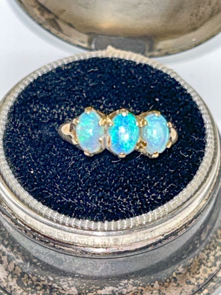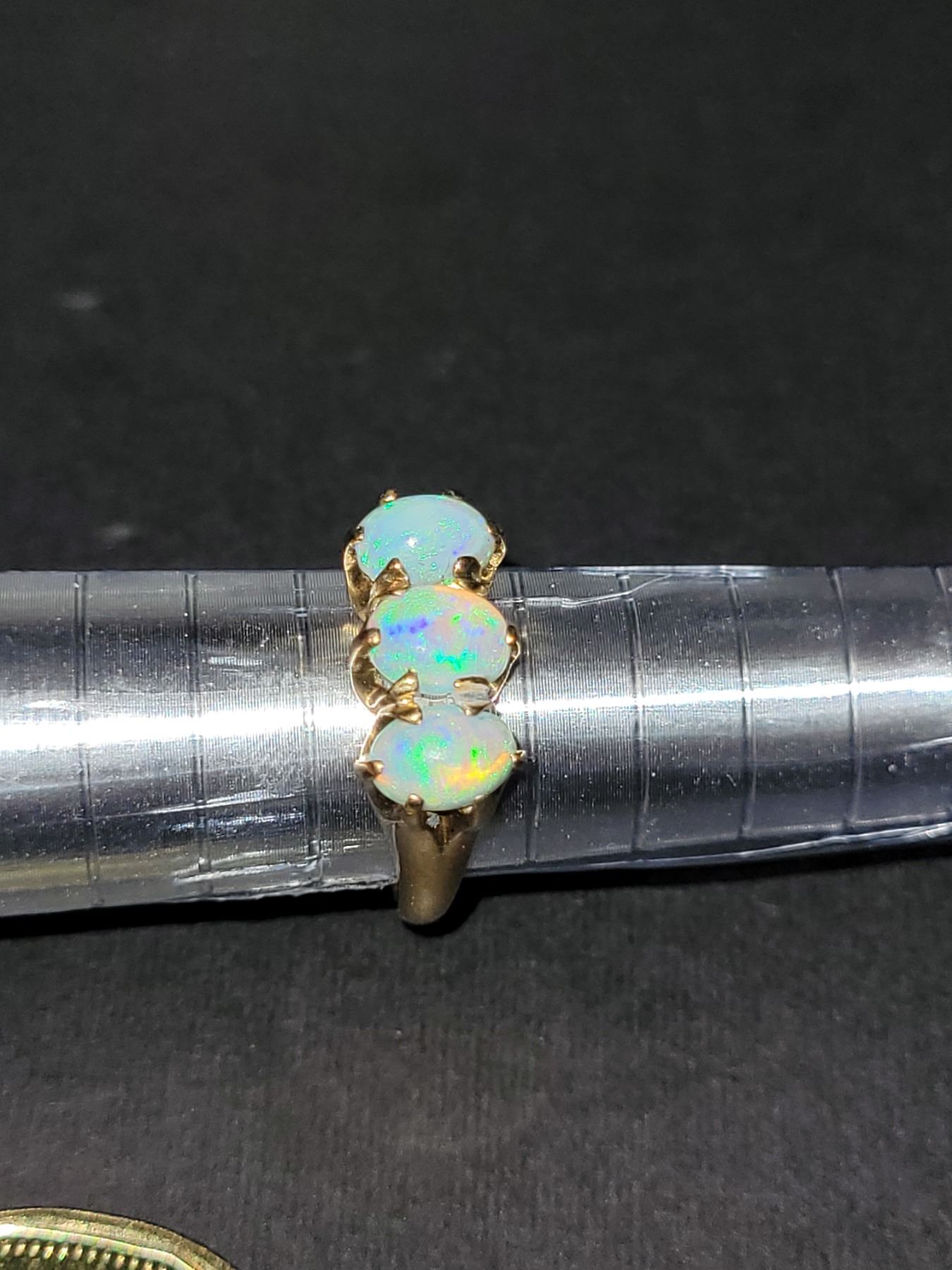 AMAZING DARK SOLID OPALS WITH COLOUR ALL THE WAY THROUGH TO THE BACK. ANTIQUE RING. 15K GOLD WITH A 1901 INSCRIPTION 2.75G