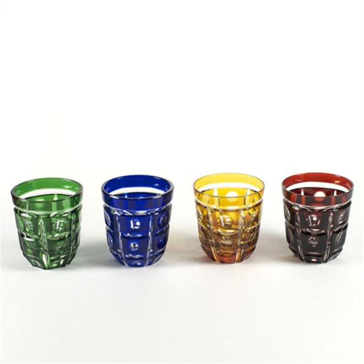 AMAZING Faberge Style Crystal Tumbler Glasses, Set of 4, A diversity of clear forms, fascinating brilliant deep cuts and glittering colors imparts classic Faberge style colored crystal glasses its special charm.Set includes the following sparkling colors: amber, copper ruby, green, blue. Hand blown, hand cut, 24% lead crystal, Dimensions 2.5in (H)