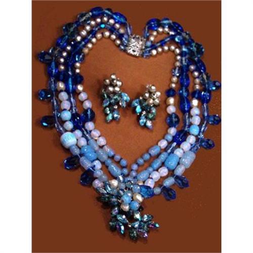 This is an early Robert piece that is so heavy and loaded with so many types of crystals and luminescent stones that you just can?t see it all. This has the well known huge drippping CLUSTER front layered drop as well as the cluster earrings. There are glass baroque pearl colored beads. The signature Originals by Robert -- (1942 -1979) is on the front drop and Robert is on the earrings. The Firm Also Supplied Jewelry To Movies, including The Jewelry For The 1952 Oscar Nominated Elia Kazan Movie, "Viva Zapata", Featuring Marlon Brando And Jean Peters.Robert pieces were quite expensive and of consistently high quality. This necklace is 15" long on the inside and is over 2" WIDE. The stones are more powder blue ( they look turquoise color in the photos) and the milky ones are really like fiery moonstones color. These are are long tear drop crystal drops as well. All the stones are glass. The earrings are 1 7/8" long and made in layers with this pretty baroque pearl color cluster top. The marquise rhinestones have a rich aurora borealis blue green. The set seems to be in very good shape. The only thing I noticed is the head pin ends have some verdigris on the earrings. This is an exceptional set and MUCH nicer than the photos.