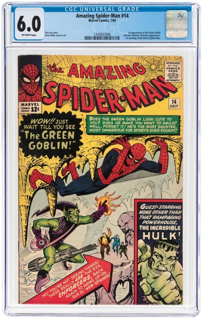 Marvel. First appearance of The Green Goblin (Norman Osborn). Enforcers appearance. First meeting of The Incredible Hulk and Spider-Man. Stan Lee story. Steve Ditko cover and art. Off-white pages. Key Silver Age Spider-Man comic.