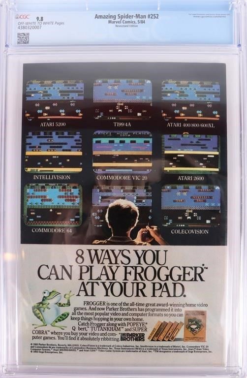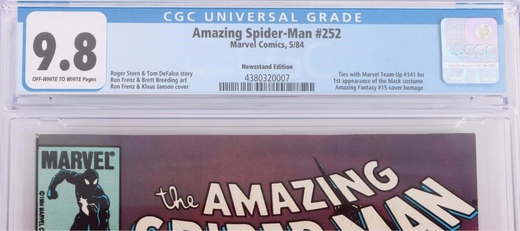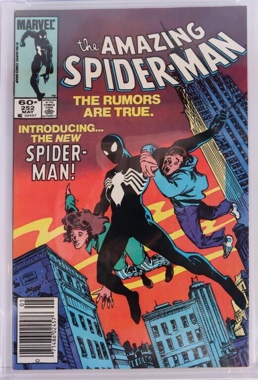 Marvel Amazing Spider-Man #252 CGC 9.8 Newsstand Edition Off-White to White pages. This Bronze Age comic ties with Marvel Team-Up #141 for introducing the 1st appearance of the black costume. Cover pays homage to Amazing Fantasy #15 cover.