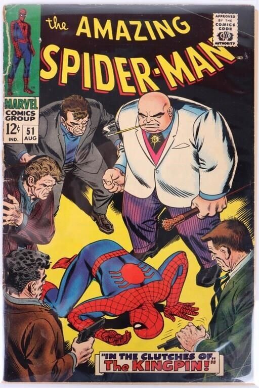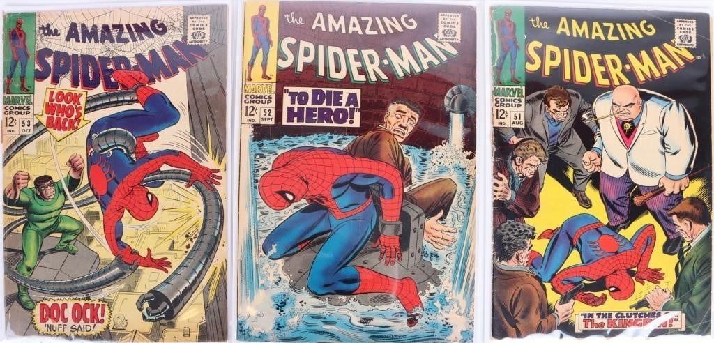 Amazing Spider-Man silver age comic books to include #51 (1st appearance of Robbie Robertson, a mentor to Peter Parker at the Daily Bugle and a foil to J. Jonah Jameson, 2nd full appearance and 1st cover of Kingpin), #52 (3rd appearance of Kingpin), and #53.