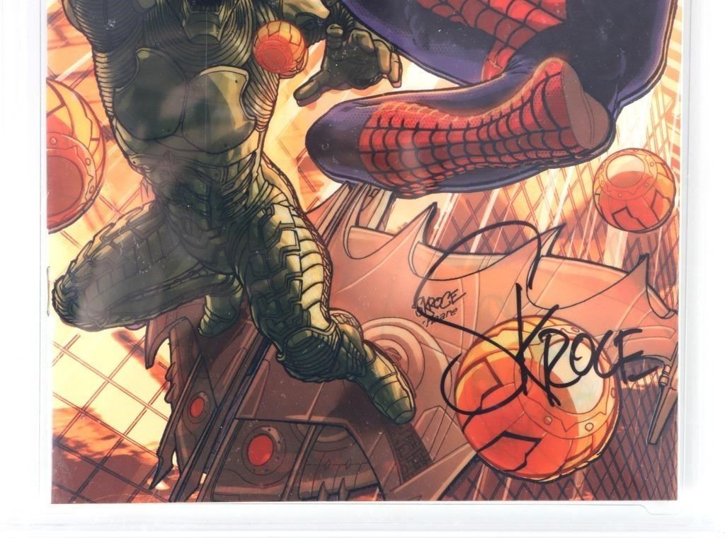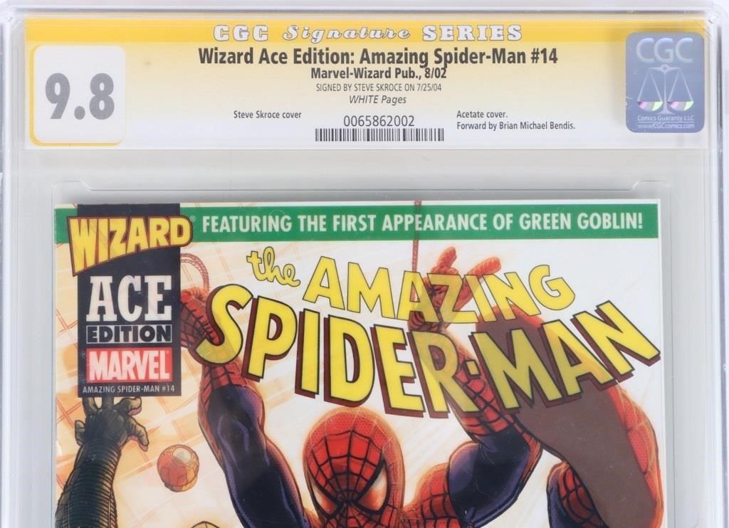 Wizard Ace Edition: Amazing Spider-Man #14 Signed by Steve Skroce on 7/25/2004. CGC 9.8. Published 2002 by Marvel & Wizard Ace. To feature cover art by Steve Skroce influenced by the Spicer-Man Motion Picture.