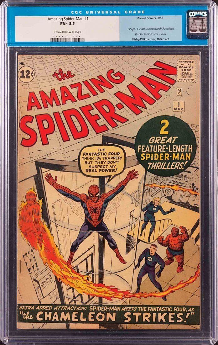 AMAZING SPIDERMAN COMIC #1 - Issue #1 of Amazing Spider-Man comic book CGC graded 5.5. This first-ever dedicated Spider-Man comic also features the first appearance of J. Jonah Jameson and villain Chameleon. March 1963.