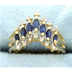 In 14K yellow gold, it contains seven natural marquise cut sapphires ranging from 3 to 4.5mm each. Also contains fourteen .01ct diamonds. Size 8 4.1