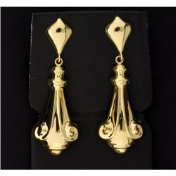 They are 14K yellow gold and are 1 1/2 inches long. They have great detail-one earring has a few indentations that are hardly noticeable. 3.9g