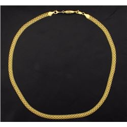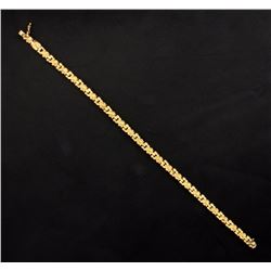 14K yellow gold, it is 7 inches long and 10mm wide. It has a safety chain. 13.4g