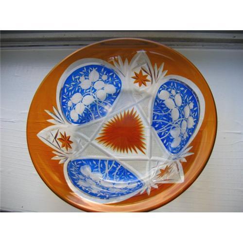 This is a gorgeous two-tone large cut to clear glass bowl. The body of the bowl is a rich, deep amber; there are 3 panels in a lovely blue, each with etched/cut leaves, flowers, and strawberries, rendered in fine detail. There are 3 stars around the sides in amber, and a triangular starbust at the coneter in amber. You can feel that the designs were hand-cut. On the bottom is an acid etched insignia that is hard to read, but says Czechoslovakian Made. I see no chips or cracks.