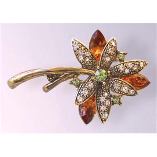 AMBER FLOWER PIN BROOCH GOLD & SWAROVSKI CRYSTALS