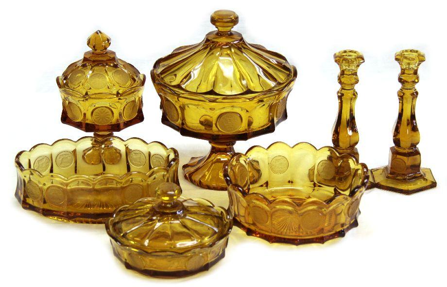 A good collection of Fostoria Coin pattern glassware in amber. Pieces include: 10.5 inch covered compote, 3x9 inch oval bowl, (2) 8 inch candle sticks holders, 3x8 inch bowl, 4x6.5 inch lidded bowl, and a 9 inch covered compote. Very good condition.