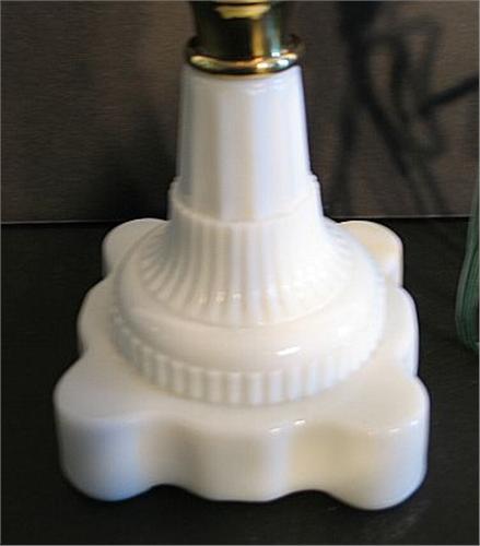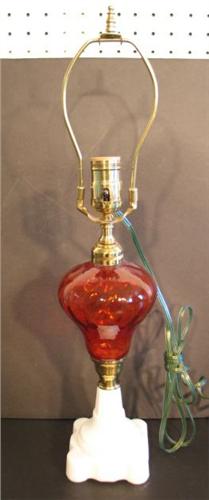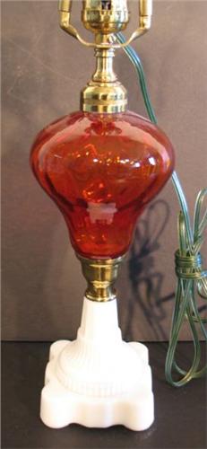 TABLE LAMP WITH AMBER GLASS BOWL. Electrified. Lamp has white sandwich glass base. 20.5” H