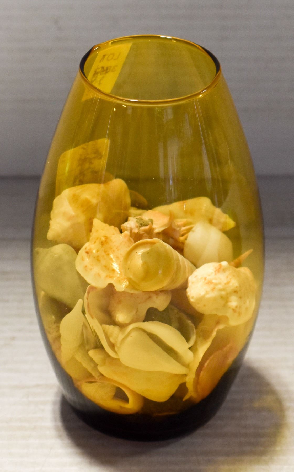 AMBER GLASS VASE FULL OF SEA SHELLS