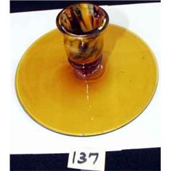 2 1/2" Amber hand blown candlestick, (nozzle has a tiny flake) . It has colorful ribbons of cased glass in colors of red, orange, white, blue, brown, green and more. 5 3/4" diameter at base. VG condition.