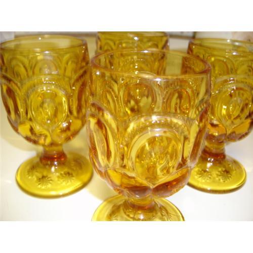 BEAUITFUL AMBER GLASS THEY ARE VERY HEAVY GOBLETS. THERE IS 9 IN ALL. LACE AND BUBBLE PRINT.