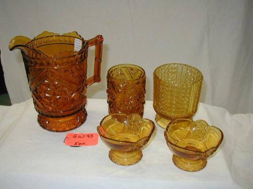 AMBER LOT INCLUDES C.1888 PITCHER DAISY & BUTTON W/ CROSS BAR(MIKADO) BY RICHARD & HARTLEY 7 1/2in, 1920'S DAISY & BUTTON JAR (W/CRACK), (2) 1890 BUTTON & DAISY SHERBERT, 1890 BUTTON & DAISY SPOONER 5inH 4inDIA, 5 PCS