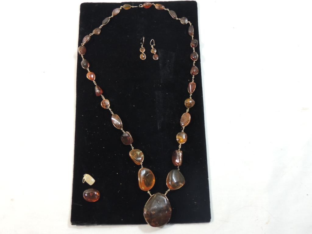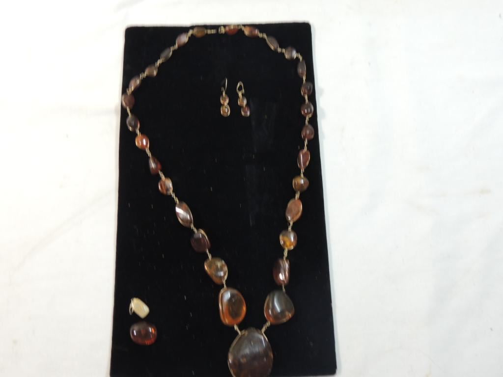 VINTAGE AMBER NECKLACE AND EARRINGS. DESIGNER UNIQUE AS SHOWN SEE PHOTO FOR MORE DETAILS.