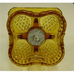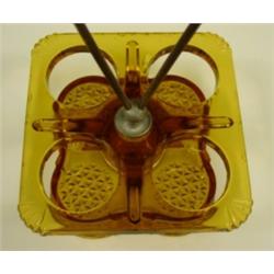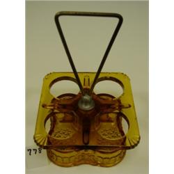 Amber pattern glass castor set base made to hold four bottles/cruets. Stars, shells and "eggs" in pattern. White metal holder bolted through center. 9" tall with handles. 5.5" wide. Condition: Some (not very noticeable) flea bites on edges.