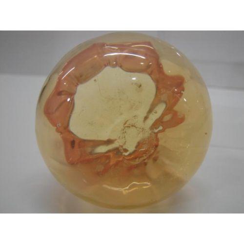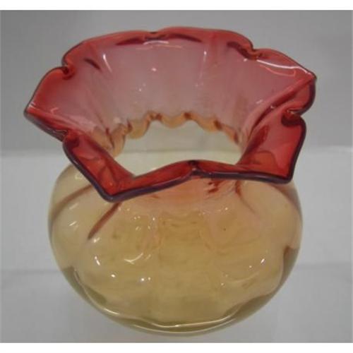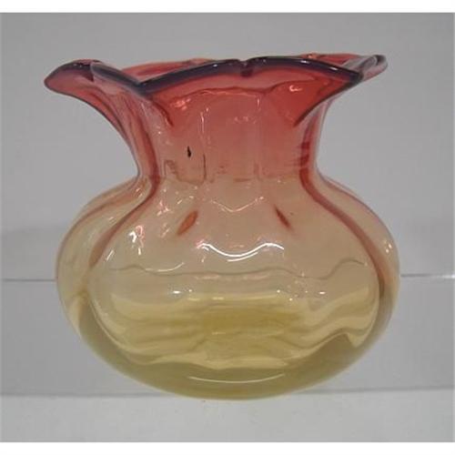 SMALL AMBERINA ART GLASS VASE. Ruffled top. Cranberry to yellow color. No mark. 2.5” H