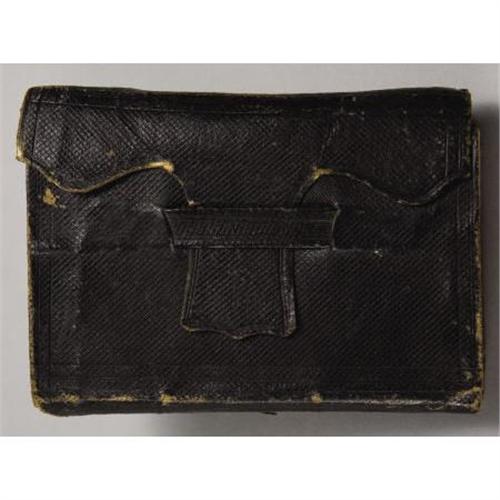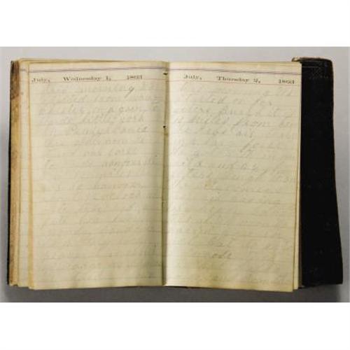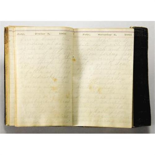 <B>AMBROS S. NICHOLS DIARY.</B></I> Exceptional Civil war-date Union Diary from 1863, with specific content regarding the historic Battle of Gettysburg as well as the preceding battle leading up to that historic confrontation, including the Battle of Brandy Station (the largest cavalry engagement of the war), Battle of Aldie (June 17), Battle of Middleburg (June17-19) and the Battle of Upperville (June 21) - essentially, the entire Gettysburg Campaign! Also discussed are numerous skirmishes and later cavalry battles and engagements such as Sulphur Springs, Auburn, Bristoe Station and Catlett Station, as well as important Military events including the execution of deserters and soldiers killed in action during skirmishes with the Confederates. Many times, the regiment traversed battlefields where the ANV and the Army of the Potomac had recently been engaged, and Nichols describes the horror of bodies and spent munitions littering the field. <BR><BR>The diary measures 4” x 2.5” x 1”, approx. 400 pages (deckle-edged), with black leather cover. Nichols has written entries in light pencil for the dates January 1-6, and again from April 12th through November 27th, including the march from Maryland up into Pennsylvania, and then back through Maryland in pursuit of the Confederates. A few excerpts from the Gettysburg campaign:<BR><BR><I>“ July, Wednesday 1, 1863 This morning we started from Manchester on again towards Little York in Pensylvania sic this afternoon. We turnd sic our horse towards Hanover we went 16 miles we got to Hanover about 1 o’clock at nite sic they had a fite sic hear sic last Monday Hanover is a vary sic nice place it is about a sic large as Elmira, we staid sic in town. July, Thursday 2, 1863 This morning we stated on for Getersburgh sic it is 16 miles from hear sic the Rebs air sic thair sic in a large forse sic we got within one mile an a 1/2 if sic Getersburgh sic then the fite sic comenc sic they air sic having vary sic heavy cannonading sic this afternoon we haint sic gone in yet but tomorrow I suppose that we shal sic haf sic to go in and clean them out. July, Friday 3, 1863 Firing comec sic this morning at day brake sic all along the time and they kept it up all thru the day, I think that it is fool as hard a battle as wehad at Fredricksburgh sic it was a continual raseing sic all the time. We took about 9 or 10 thousand prisnors, I think it will bee sic a day long to bee sic remembered in Gatersburgh sic it is now. July, Saturday 4, 1863 They kept up the fite sic last nite sic till 10 o’clock and thair sic is som sic firing hear sic this morning but not a grate sic deal for I think that the Rebs had enough of it yesterday for thair sic loss must bee sic vary sic hevy sic for we mode sic them down like grass we had campt sic about one mile and 1/2 east from the village it comenc sic raining hear sic . July, Sunday 5, 1863 We went into the village this mornig and comenc sic buring our ded sic and it was a dredful sic site sic to behold our ded sic solgers sic lay all over the ground as thick as they could lay Gersburgh sic is a vary sic nise sic place it is about as lag sic as Norwich, the inhabitanc sic was vary sic kind to the solgers sic evry sic church and evry sic other business sic was fool of wounded solgers sic . July, Monday 6, 1863 This morning we started on again after the Rebs we saw lots of solgers sic that was washed out thair sic they was burid sic for they want coverd more than 1 feet deep. We went about 6 miles then we had to go back with som sic prisnors sic and then we went on again we went on about 8 miles and campt sic for the nite sic at the foot of the mountain.”</B></I><BR><BR>Exceptional content from this war-weary soldier. Contemporary eyewitness accounts of the Battle of Gettysburg are some of the most important and desirable manuscripts of the Civil War, and this handwritten diary is especially significant. Not only does it cover the action at Gettysburg, but also the precipitous engagement at Brandy Station and many other important cavalry clashes during the crucial year of 1863. Surviving Civil War diaries from cavalry regiments are especially rare.<BR><BR><B>Condition:</B></I> In fine condition with abrasions to the cover, typical of bound volumes of this age. <BR><BR><b>Shipping:</b> Flat Material, Small (<a target="_blank" href="http://www.heritageauctions.com/common/shipping.php">view shipping information</a>)