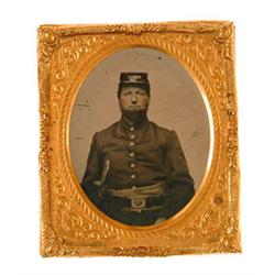 AMBROTYPE OF CIVIL WAR OFFICER. Found in Berwick, ME attic of descendants of David H. Bracket who was enlisted in the Company B Maine 27th Infantry in September 30, 1862. Bracket was promoted to Corporal and we are not certain as to whether this image is of Bracket or one of his officers. It depicts a bearded officer with sword belt and sash. SIZE: 2-3/4" wide x 3-1/4" tall. CONDITION: A couple of minor scratches in the background, image itself is strong and cheeks are highlighted in pink. 4-53629