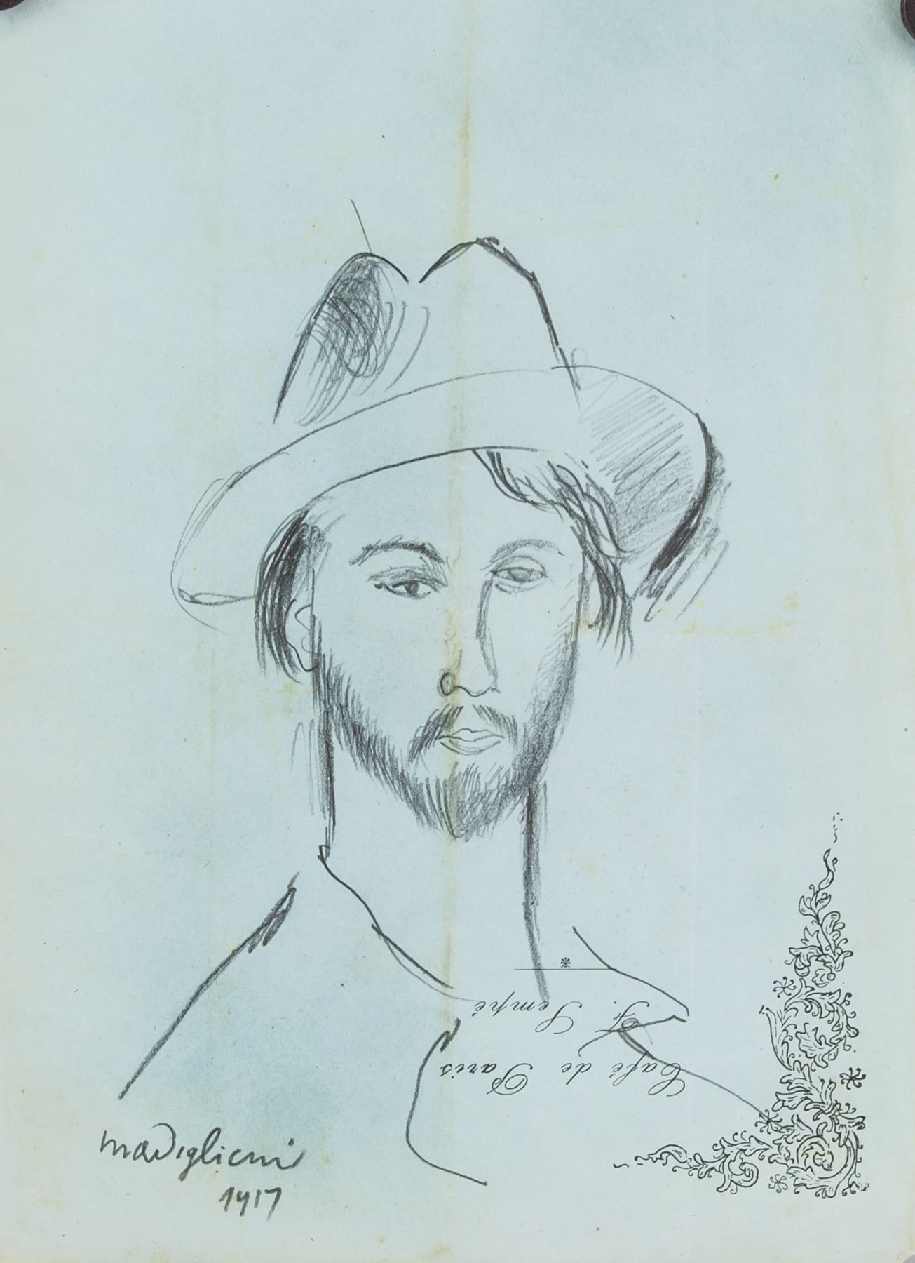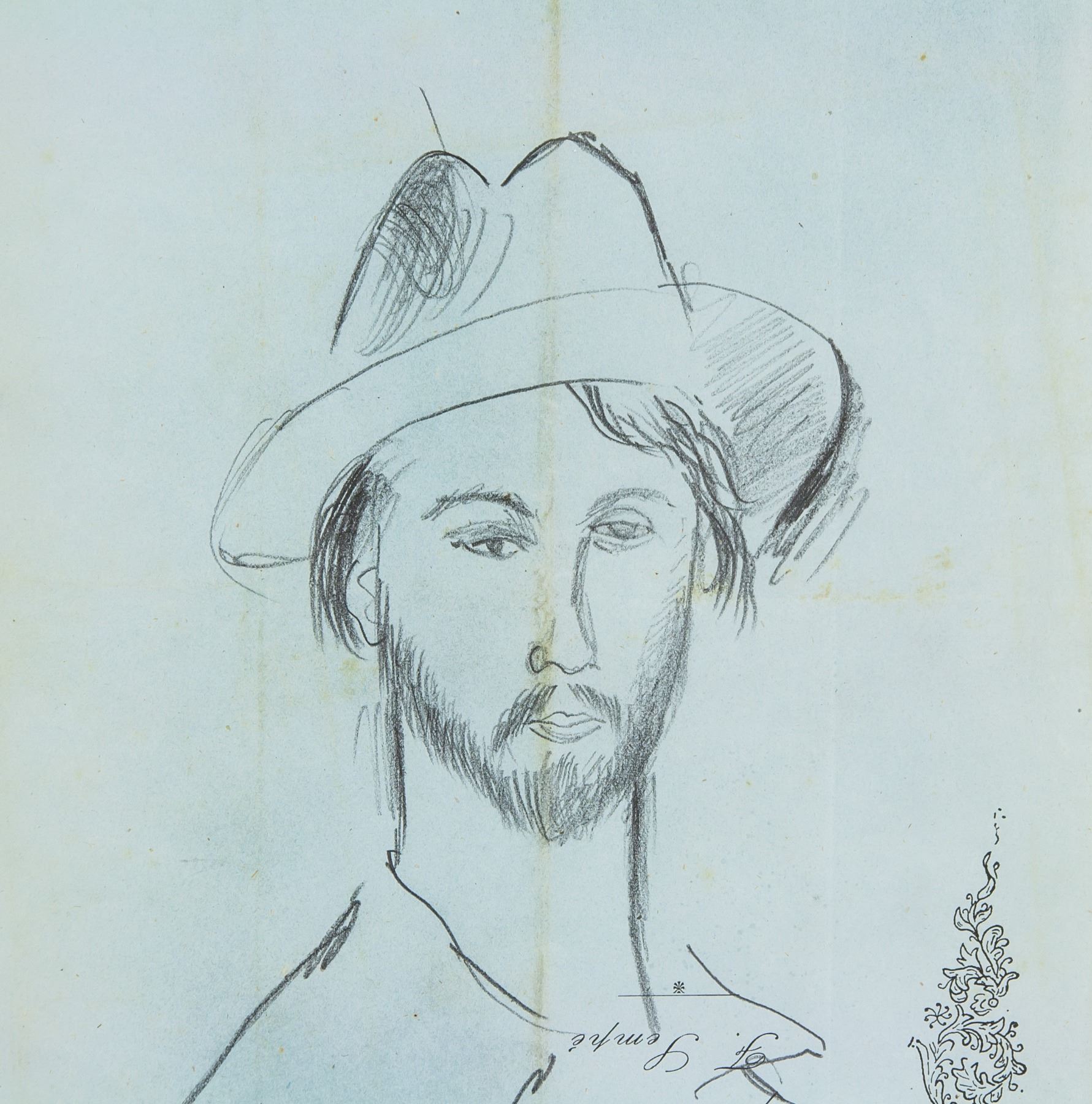 Pencil on paper. Featuring portrait of a man with hat. Signed and attr. Amedeo Modigliani (Italian 1884-1920). Signature on the lower left corner. 11 x 8 in (27.9 x 20.3 cm). Modigliani's portraiture achieves a unique combination of specificity and generalization. His portraits convey his subjects' personalities, while his trademark stylization and use of recurring motifs - long necks and almond-shaped eyes - lends them uniformity. Modigliani's portraiture also serves as a vital art historic record, comprising a gallery of major figures of the Ecole de Paris circle, to which he belonged following his move to Paris in 1906.