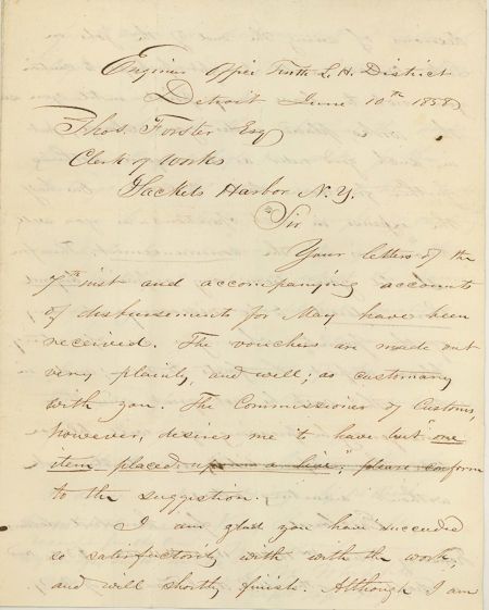 (1816 - 1863) Union major general who led a division in the defense of Washington, at Fredericksburg, and at Chancellorsville where he was mortally wounded. Scarce A.L.S. "A. W. Whipple" as Captain of Topographical Engineers, 3pp. 4to., Detroit, June 10, 1858 to the Clerk of Works at Sackets Harbor, N.Y. In part: "...I am glad you have succeeded so satisfactorily with the work; and will shortly finish...I am desirous of seeing the end of the jobs on Lake Ontario...I ought perhaps to caution you not to leave any point until you see the works, placed under your charge, in such good order as to require nothing further for some time to come...please execute the work without awaiting orders. Enclosed are five hundred dollars Treasury Notes..." A few foxed spots in text, folds, else very good.