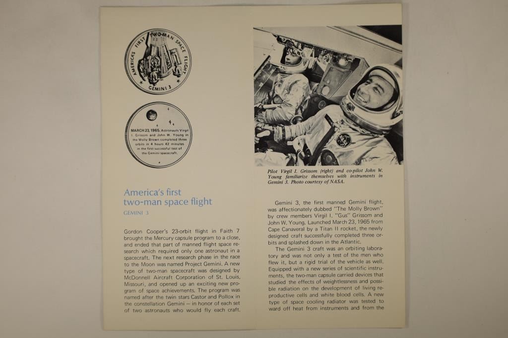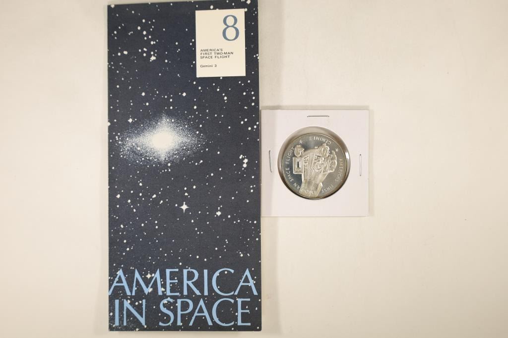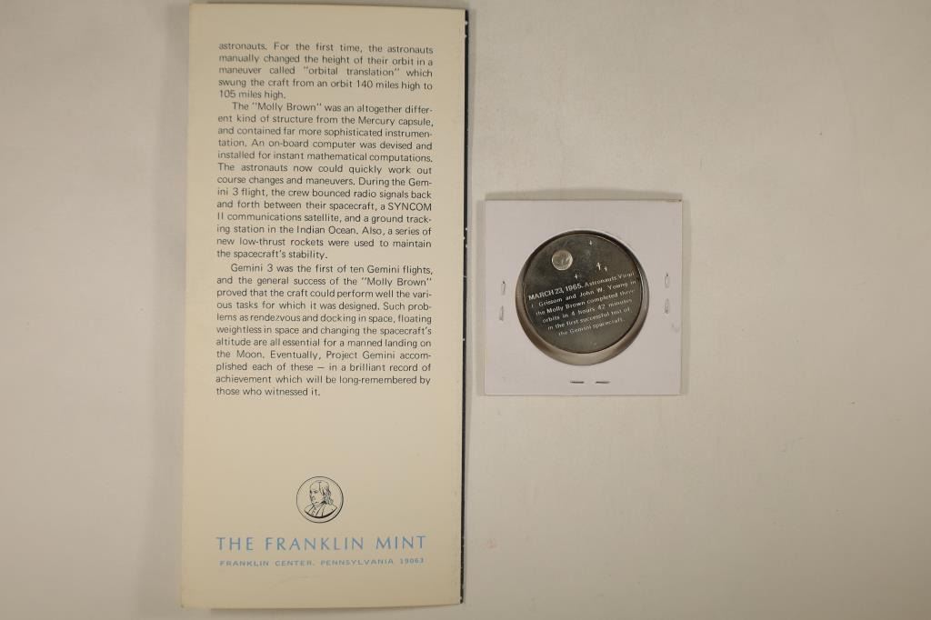 ROUND FROM THE FRANKLIN MINT, MARCH 23RD 1965, AMERICA'S FIRST TWO-MAN SPACE FLIGHT (GEMINI 3) WITH INFO SHEET.
