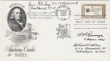 First day postal cover signed by four of the U.S.'s top sub commanders of World War II, including LAWSON P. RAMAGE, RICHARD H. O'KANE, GEORGE L. STREET and EUGENE FLUCKEY. Fine.
