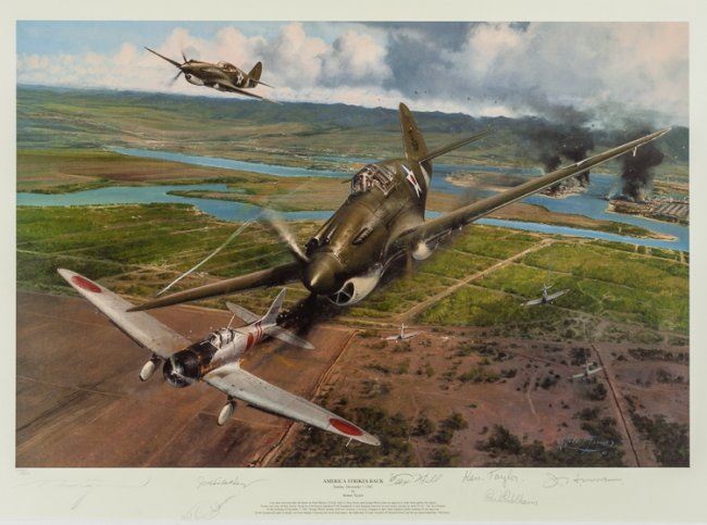 Signed print, 18 1/2" x 25 1/2" visible, by Robert Taylor, depicting American fighter aces KEN M. TAYLOR (1919-2006) and GEORGE WELCH (1918-1954) attacking a group of Japanese D3A "Val" dive bombers in their P-40B Warhawk fighters, during the air attack on Pearl Harbor. Both pilots would each receive credit for destroying four Japanese aircraft during the attack. The print is signed in pencil by the ace, along with six other American pilots, including TEX HILL. The print is matted and mounted in a wooden frame. Fine.