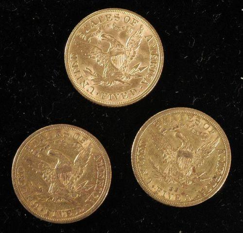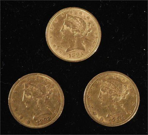 AMERICAN $5 GOLD PIECES (3), 1892CC, 1895 and
