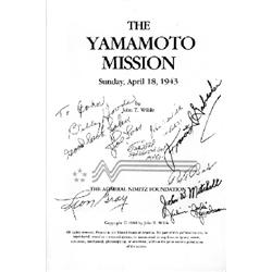 <b>1132. AMERICAN ACES OF WORLD WAR II </b>A great grouping of nine signatures of American aces of World War II. The signatures are penned on the flyleaf of a paperback book, <i>The Yamamoto Mission</i>, abt. 50pp. 8vo., published by the Admiral Nimitz Foundation, 1988, signed by <b>JOE FOSS</b>, <b>BILL HOODE</b>, <b>FRANCIS GABRESKI</b>, <b>TEX HILL</b>, <b>LEON GRAY</b>,<b> JACK JACOBSON</b>, <b>JOHN W. MITCHELL</b> and others. Fine. <b>$100-150</b>