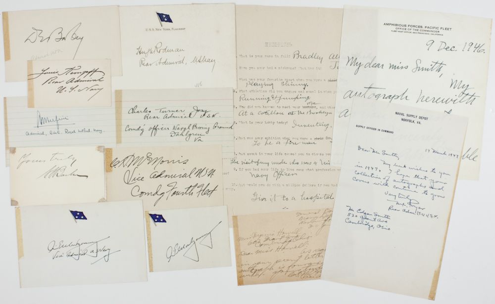 A group of thirteen signatures of Admirals and Naval officers, mostly in signed card format, includes: HUGH RODMAN, BRADLEY ALLEN FISKE (an interesting questionnaire in which Fiske adds his hobby as "Inventing"), , DANIEL E. BARBEY, ALFRED EUGENE MONTGOMERY (2), CHARLES MCMORRIS (2), CHARLES TURNER JOY, ALBERT S. BARKER, ARTHUR D. STRUBLE, LOUIS KEMPFF, and another not identified by us. Condition ranges from good to very good.