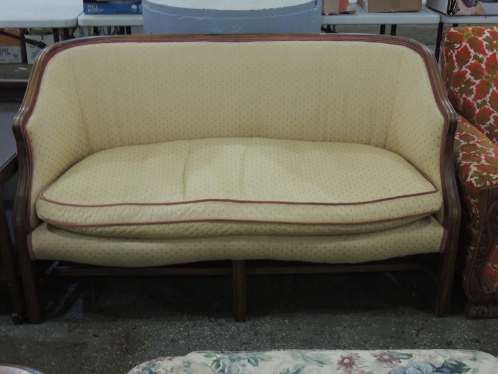MAVUE AND CREAM YELLOW LOVESEAT SOFA AS SHOWN. SEE PHOTO FOR MORE DETAILS.