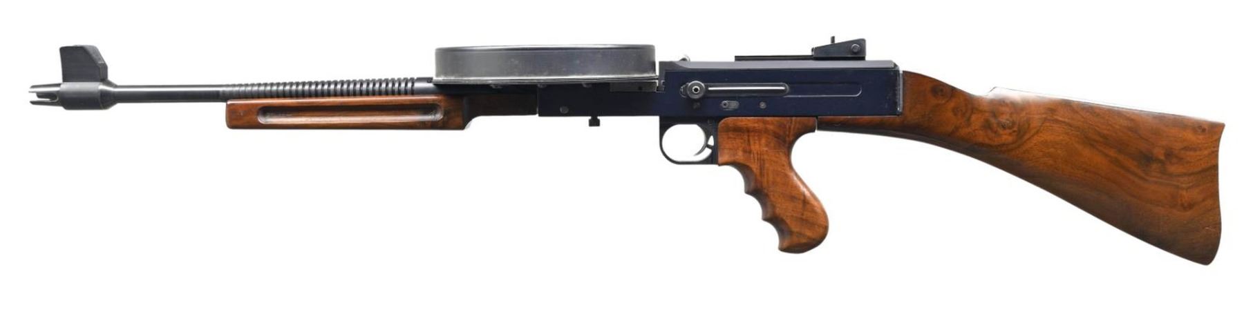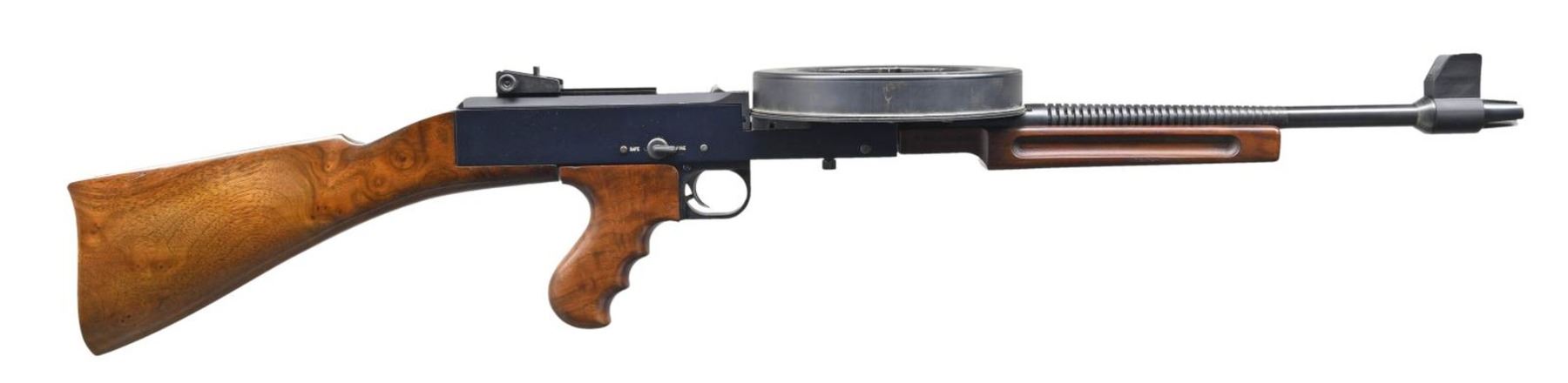 RIFLE. Cal. 22 LR. S# C01082. Bbl. 18" w/ flash hider. Blade front sight w/ protective ears. Adjustable aperture rear sight. Austrian made semi auto version of the famous American 180 submachine gun. Blued finish. Walnut stock, forend & pistol grip. MAGS: 1-176 rd. drum. CONDITION: stock set has varnish finish w/ some dings & handling marks. Metal retains 97% original blue w/ some light freckling on receiver. Bright near excellent bore. PROVENANCE: Lifelong Collection of Terrance McCarty. (24-531/MJC). MODERN. $1000-1500.
