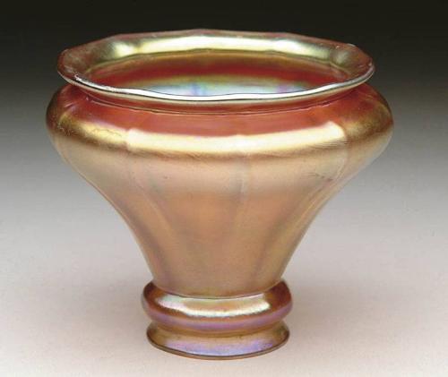 AMERICAN ART GLASS SHADE. Gold iridescent art glass shade is nicely ribbed and skirted. Unsigned. SIZE: 2-1/4” fitter rim x 4-1/2" t. CONDITION: Very good to excellent. 5-61681