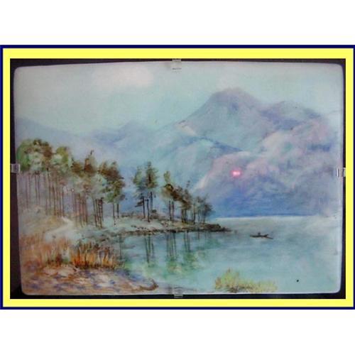American art tile / plaque handpainted with a landscape. Framed and under glass.<BR>Plaque measures 5 1/2 X 4 inches. Frame is 12 3/8 X 10 3/8inches.<BR>A small boat with barely visible person rowing in a lake, reflecting trees and mountains. Forest and field scene on lower left, mountains in the background. Very nice detail. Beautiful colouring.<BR>Not out of frame, so we don't know what marks are on the back. <BR>Excellent condition. No damage of any sort.