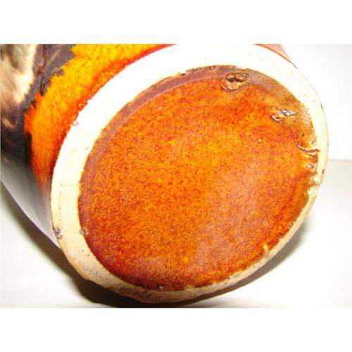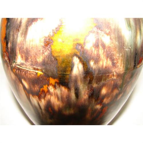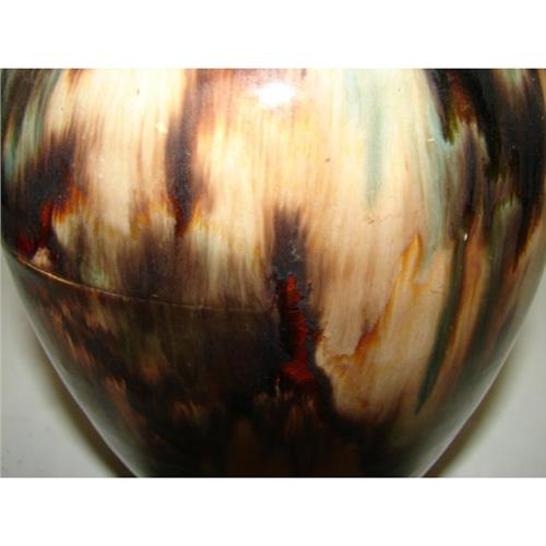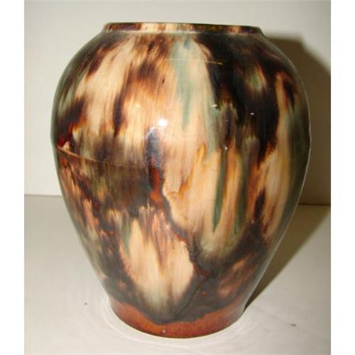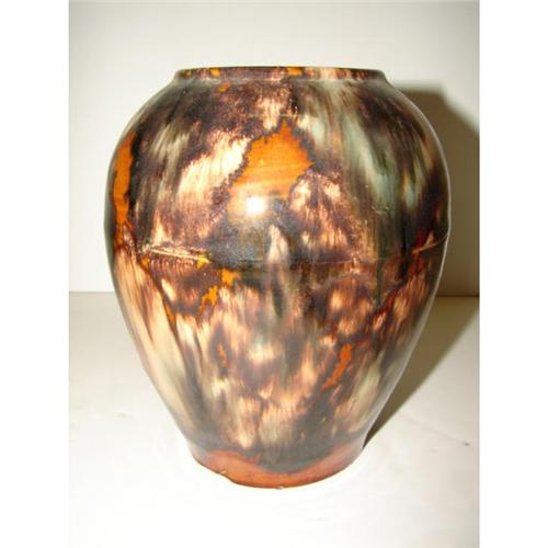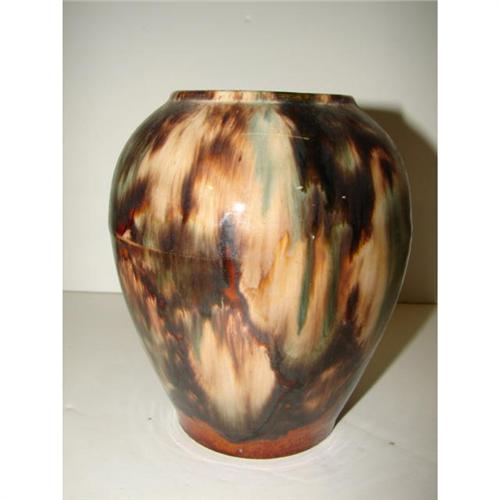 AMERICAN ART POTTERY VASE. Brown vase contains a blue, white, & black marbleized glaze. A horizontal seam line runs completely around body and is visible on exterior and interior. No mark. 6.25” H