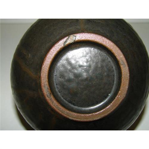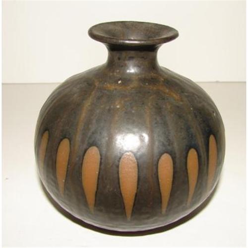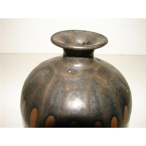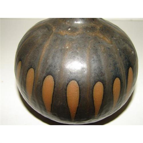 AMERICAN ART POTTERY VASE. Dark brown glaze with light brown inverted tear drop decoration around body. 4” H