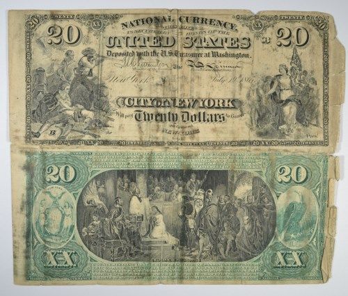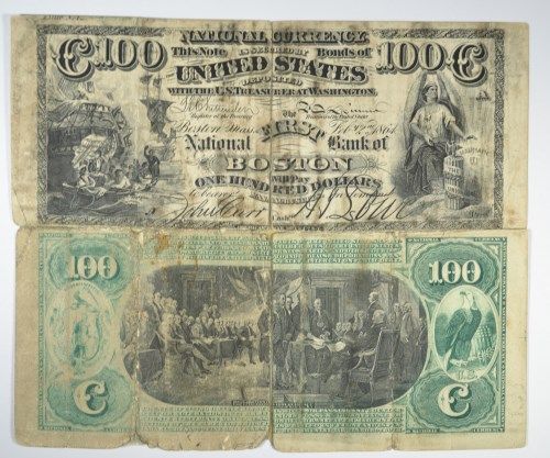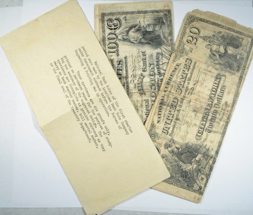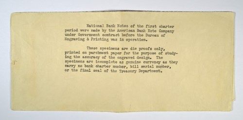 PRINTED ON PARCHMENT PAPER OF NATIONAL BANK NOTES OF THE FIRST CHARTER, INCOMPLETE AS GENUINE CURRENCY, BUT NICE OLD COLLECTIBLES! ESTIMATE, $150.00 TO $200.00