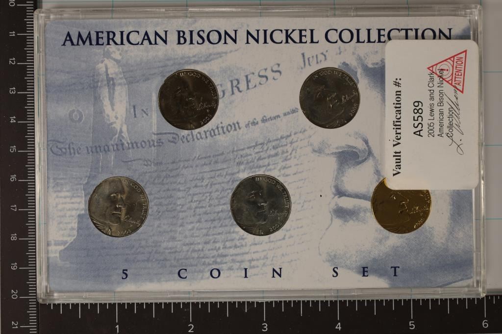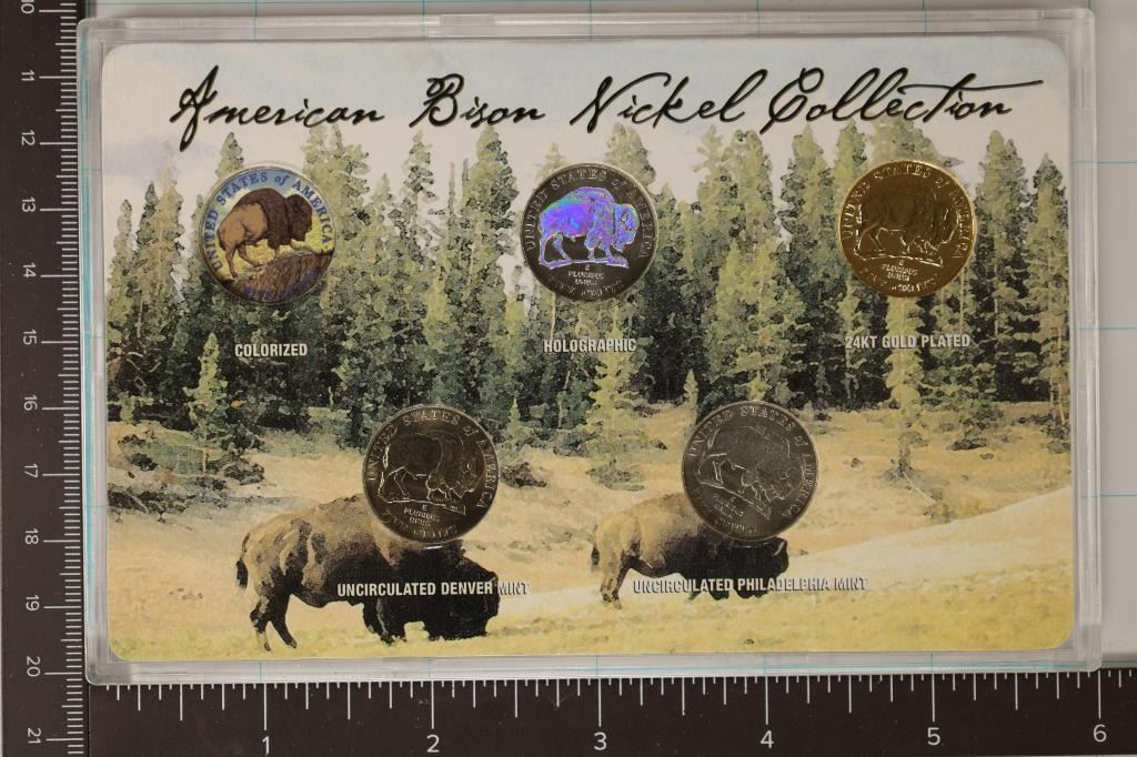 FEATURING: 2005-P & D BISON NICKEL, 2005-P COLORIZED, 2005-P HOLOGRAPHIC BISON NICKEL 2005-P 24KT GOLD PLATED BISON NICKEL, IN HARD PLASTIC CASE. VAULT VERIFICATION AS589
