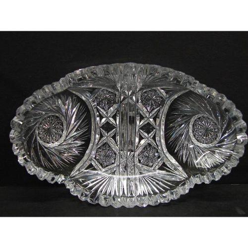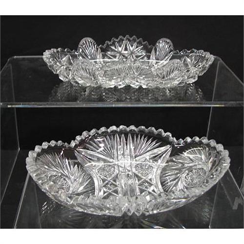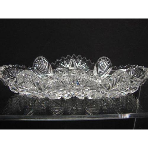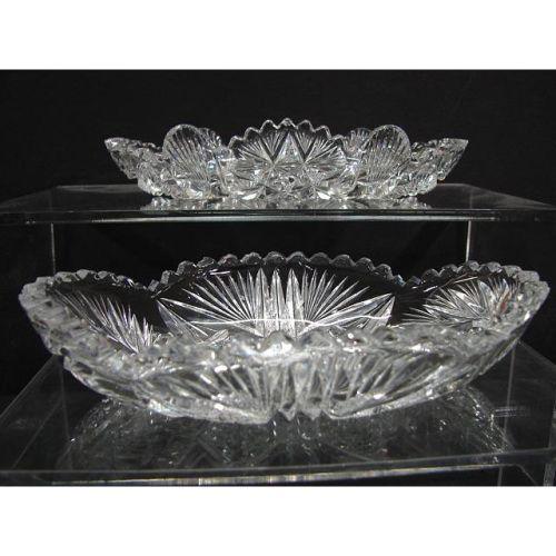 PAIR OF AMERICAN BRILLIANT CUT GLASS PICKLE DISHES. Consists of one cut starburst decorated dish with sawtooth edge (7” L) that shows some small chips to edge throughout. Also consists of one cut decorated dish with sawtooth and shell form edge (7.5” L) that shows some areas of some roughness around edge.