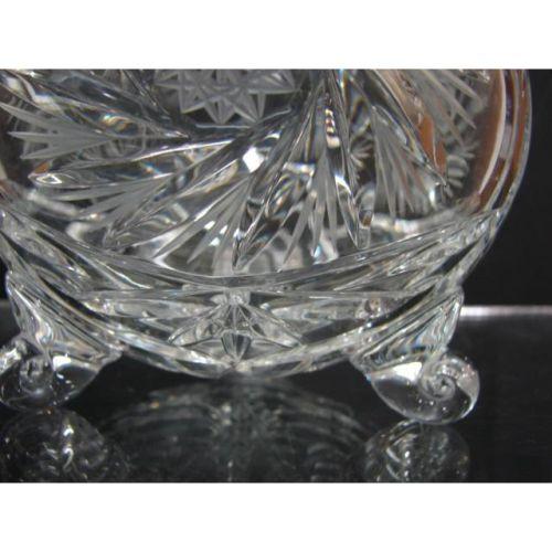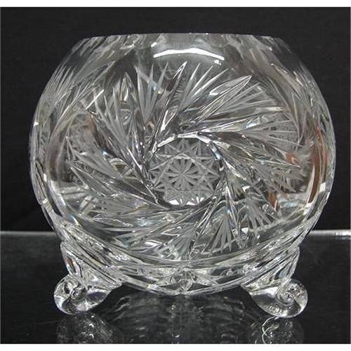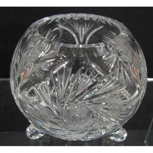 AMERICAN BRILLIANT CUT GLASS ROSE BOWL. Bowl rests on three shell form feet. Cut floral decoration with intaglio cut centers. 4.25” H