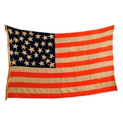 AMERICAN CIVIL WAR 34 STAR FLAG. 44" x 72". Accompanying papers with this flag state the flag was made by the John Lloyd family of Cumbola, Pa. John Lloyd was a Private in Company "H" 48th Pennsylvania Regimen. Flag is all hand-sewn. Stars are dbl appliqued, folded under and sewn and are in "folky" arrangement. Some stars are more starfish shaped and vary from 4" to 5-1/2" across. Red stripes appear to be a wool-cotton blend. White stripes appear to be cotton. Canton is also a blended cloth. Stars are cotton. Hoist is linen. This wonderful home-made flag, in old brown ink on hoist reads "48th Reg. Presented to John Lloyd 1861". CONDITION: Colors are excellent. Several stars show fraying and reduction. Scattered mothing, does not effect esthetics. Identified home-made Civil War flags are quite scarce, this flag will present very nicely. 4-53401 JS24