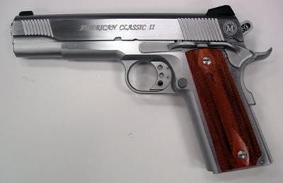 FAMILY:1911 Style Pistol Series MODEL:American Classic Government II TYPE:Semi-Auto Pistol ACTION:Single Action FINISH:Hard Chrome STOCK/FRAME:Steel Frame STOCK/GRIPS:Checkered Wood CALIBER/GAUGE:45 ACP CAPACITY:8+1 # OF MAGS:1 MAGAZINE DESC:8 rd. BARREL:5" OVERALL LENGTH:8.375" SIGHTS:Fixed SAFETY:Frame Mounted Safety