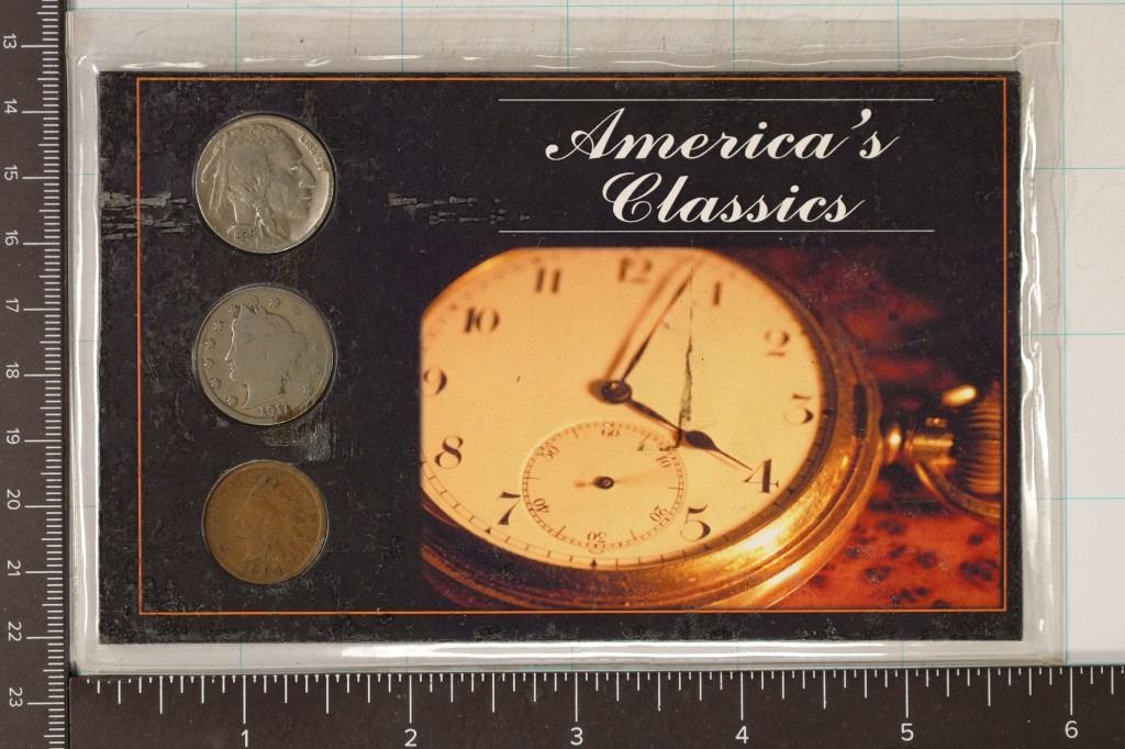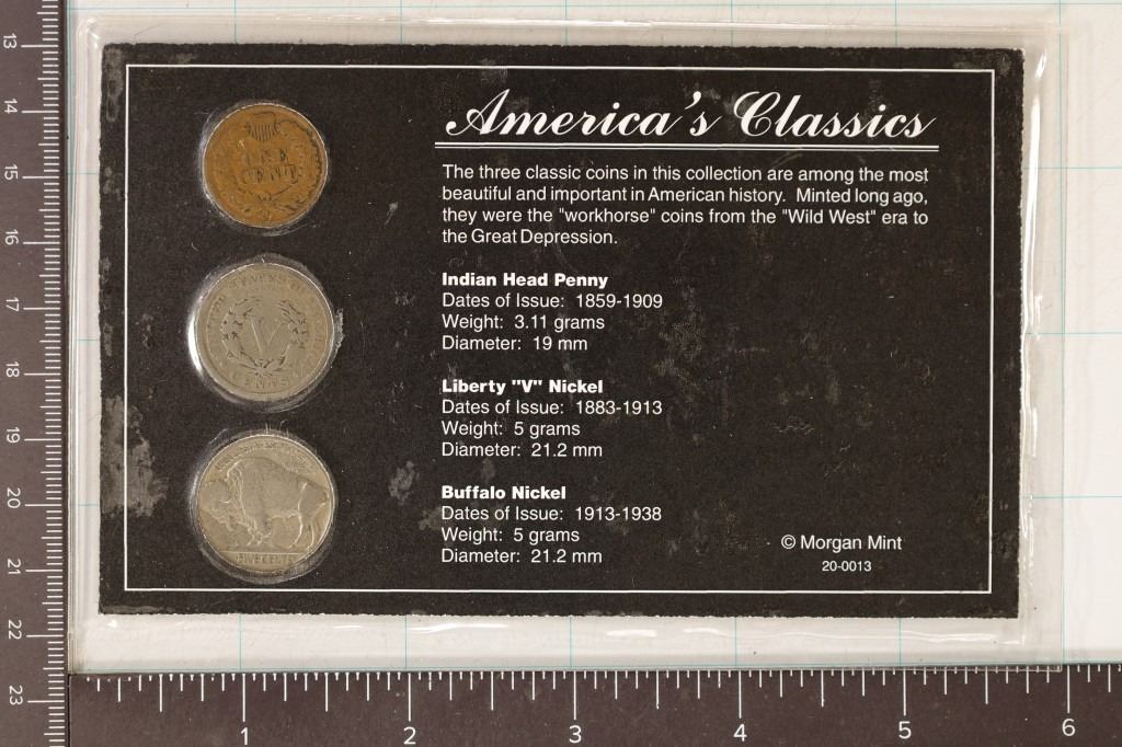 INDIAN HEAD CENT, 1911 LIBERTY "V" NICKEL AND 1936 BUFFALO NICKEL. IN CARDBOARD CARD SEALED IN PLASTIC SLEEVE