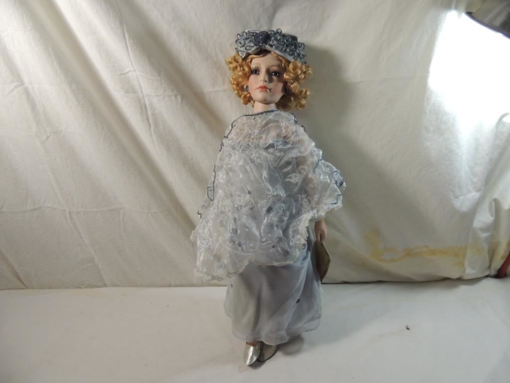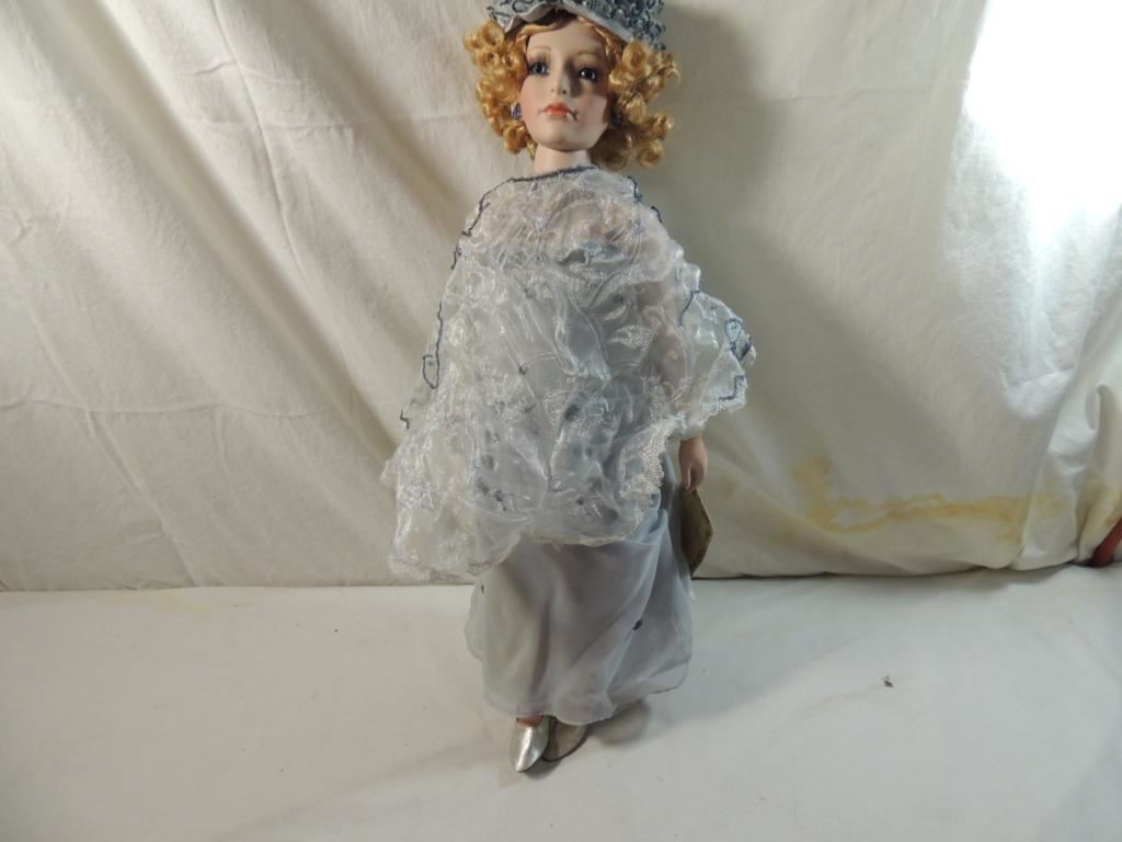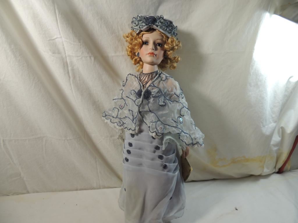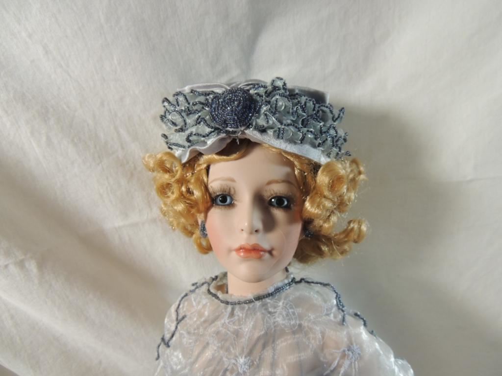 AMERICAN CLASSICS ROSE MARIE PORCELAIN DOLL DAMAGED AND REPAIRED FACE BLUE EDWARDIAN ERA DRESS BLONDE CURLS HAIR BLUE EYES AS SHOWN SEE PHOTO FOR MORE DETAILS.