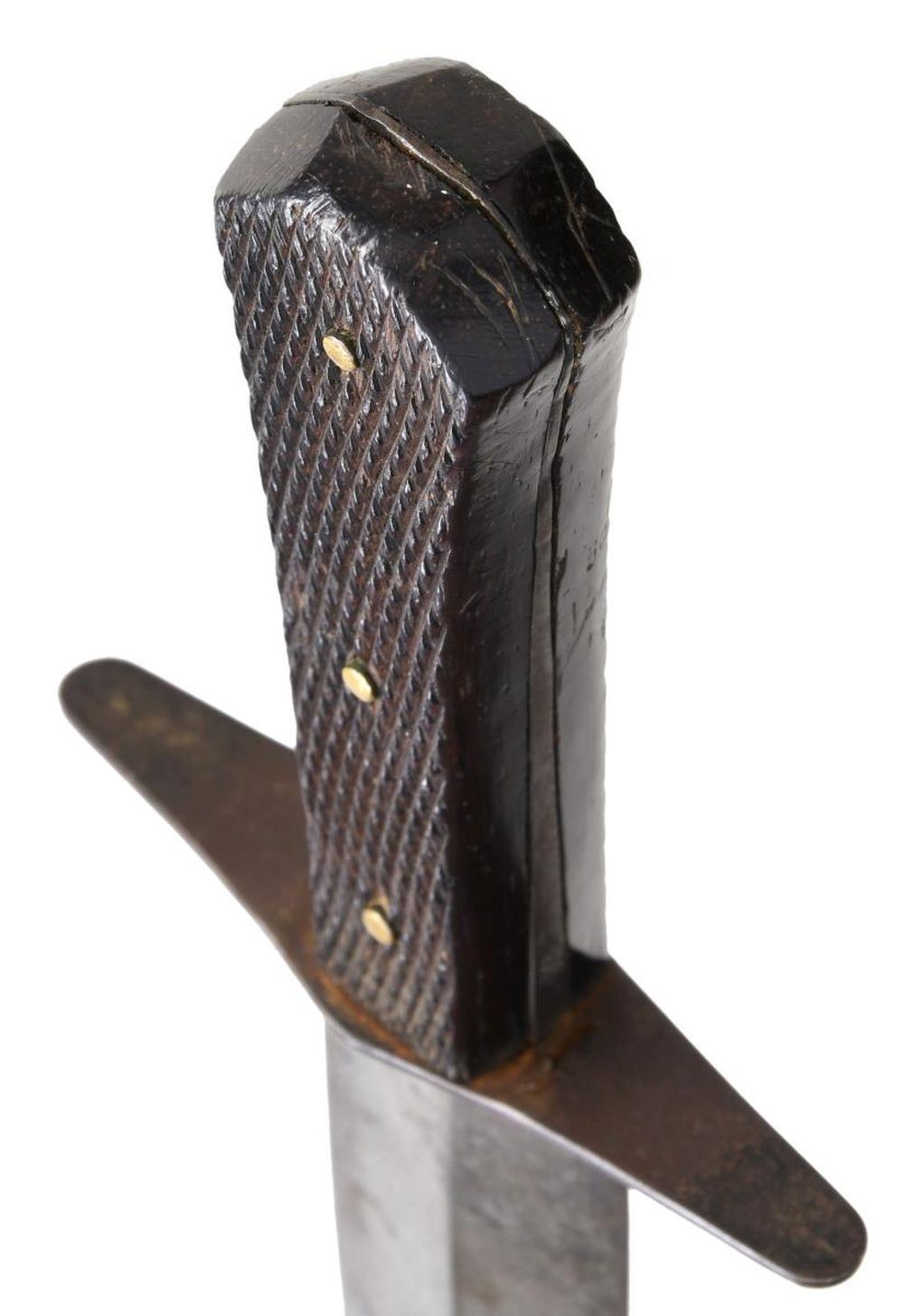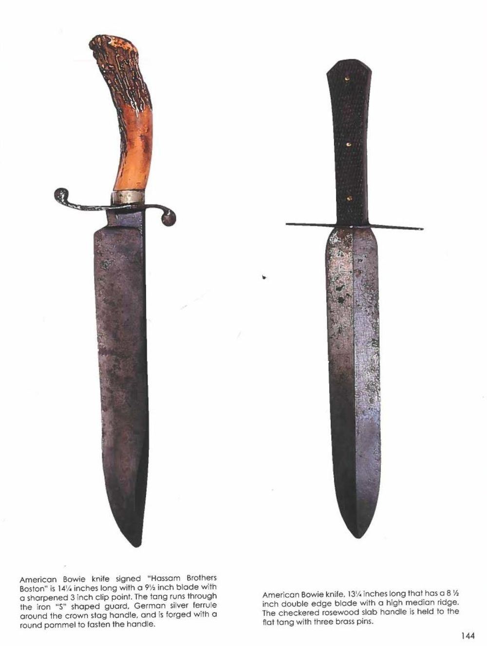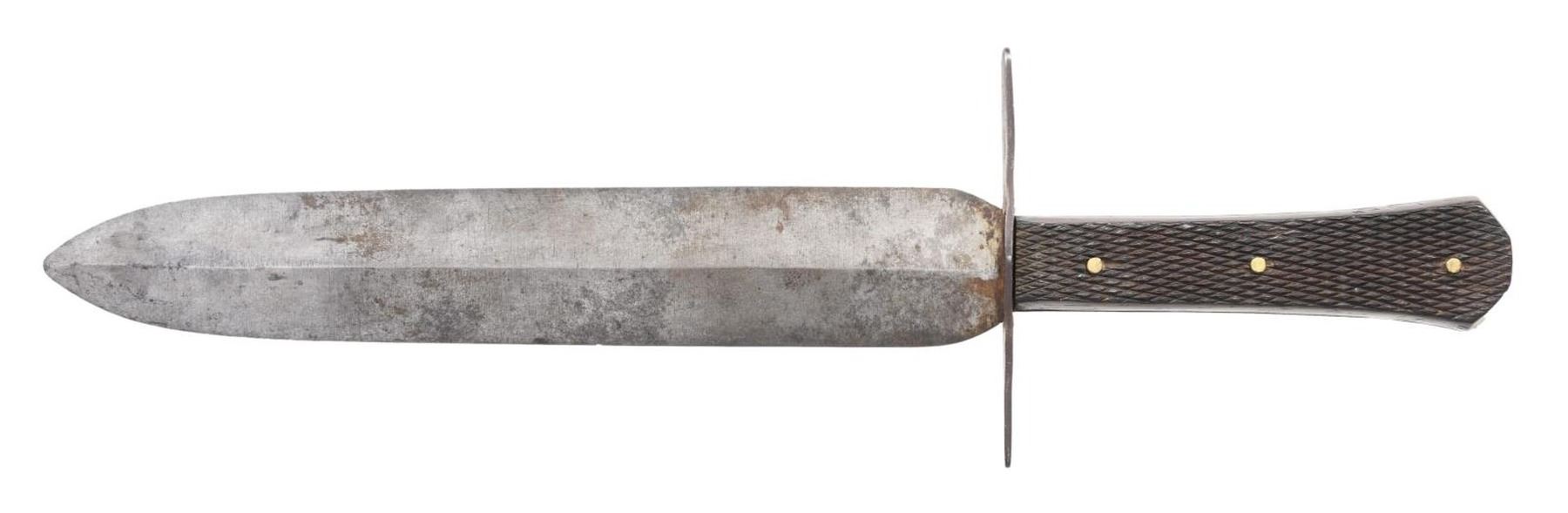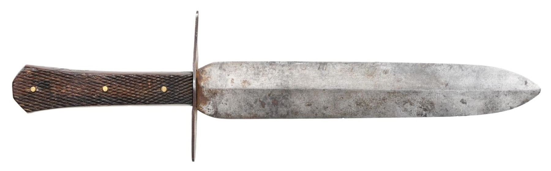 Pictured on page 144 of James R Johnston's "Accoutrements V", 13" overall, 8.5" double edged blade with medial ridge, .32" thick, full tang, finely checkered rosewood slab grip retained by 3 brass pins, 4" tapered iron cross guard. This is a finely cutlered bowie that has survived in beautiful condition. CONDITION: very good overall. PROVENANCE: James R. Johnston collection. (02-22299/JS). $2,500-3,500.