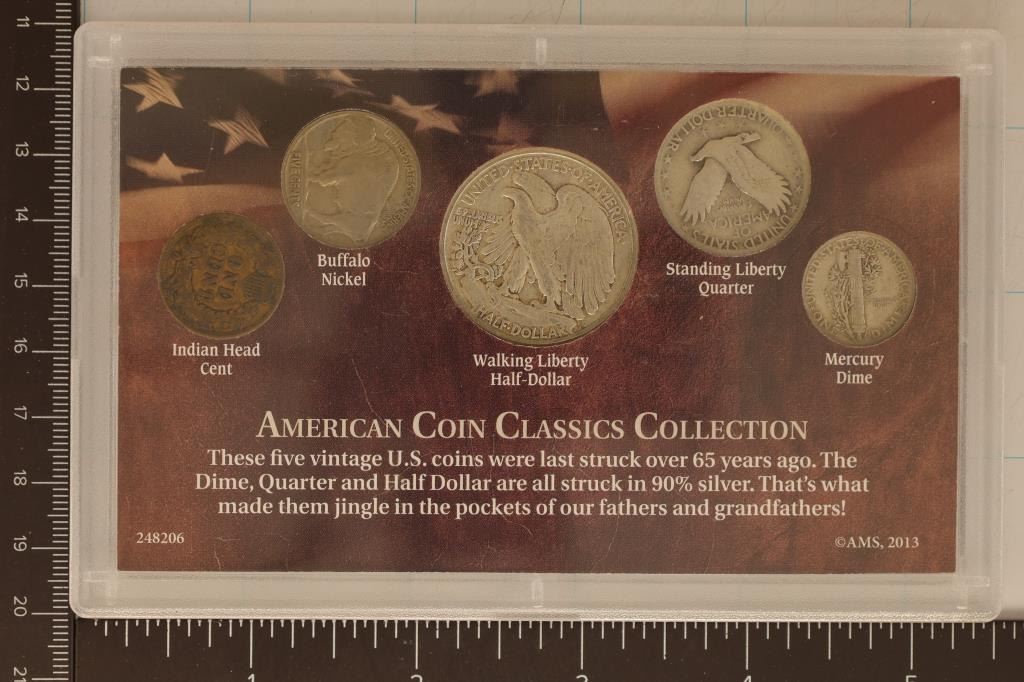 INDIAN HEAD CENT, 1935 FULL DATE BUFFALO NICKEL, 1941 SILVER MERCURY DIME, 1926 SILVER STANDING LIBERTY QUARTER AND 1944 SILVER WALKING LIBERTY HALF DOLLAR, IN HARD PLASTIC CASE