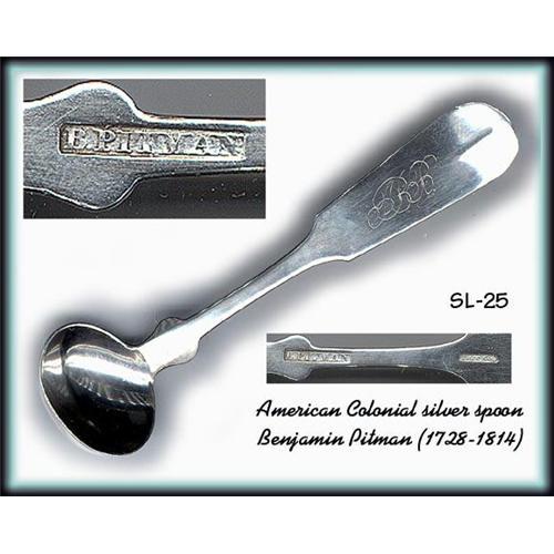 Please note that for Ebay Live Auction only bids at or above $130 will be successful and meet our reserve. This 18th Century Silver American Spoon was make by BENJAMIN PITMAN, who worked out of Providence, Rhode Island. Spoon has a standard Benjamin Pitman mark...see Kovel's "American Silver Marks", page 295. Fine example of American Colonial silver by good silversmith, original hand engraved initials ABB? Excellent Condition, 3-5/8" long. Please note that in some cases photo sizes are automatically reduced, so if you want to see full size or detailed pictures, please email us ().